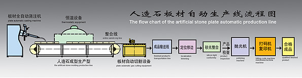该产品专用于人造石板材的生产制造,产品采用PLC程序自动控制,各种板材在制造过程中的浇注、定型、脱模、锯断经生产线自动完成,该生产线以技术优势确保高效制造出优质的人造石板材。